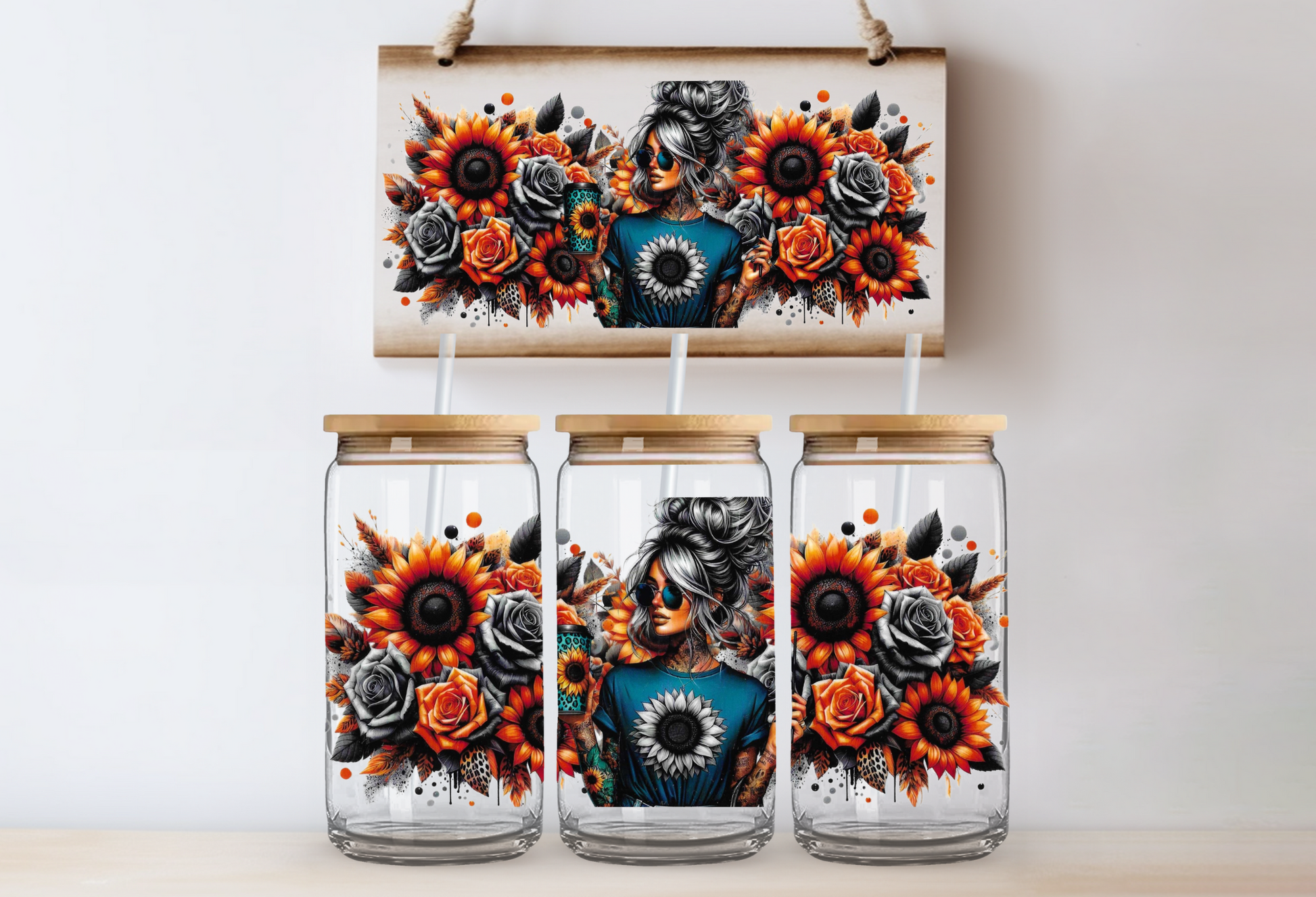 Girl with sunflowers & roses